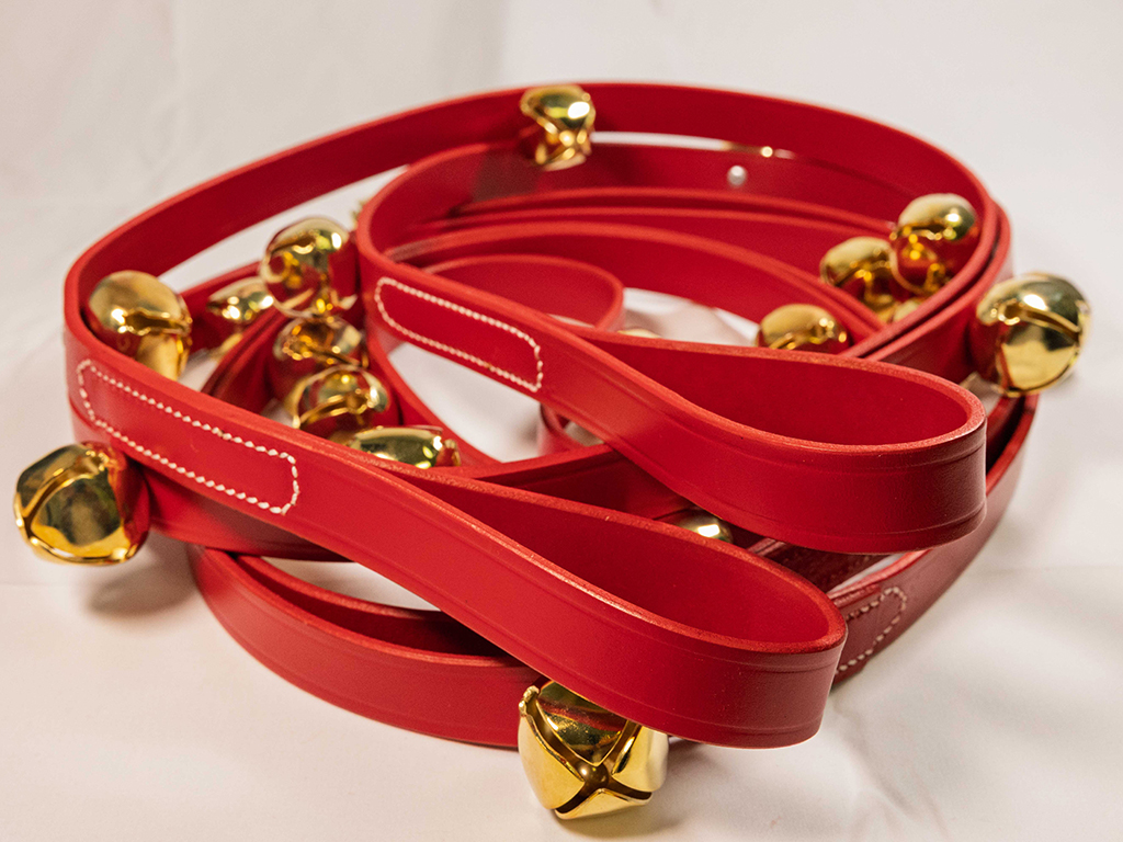 This leather harness with handles for Santa allows you to pick 9 children to be “reindeer” and lead your sleigh around your venue. The 1” red creased leather is 20 ft. long with gold steel bells placed along the harness. Each kid gets to shake the harness as you call out their names “On Dasher, Dancer, Prancer and Vixen, on Comet and Cupid and Donder and Blitzen” to the top of roof to the top of the wall, now dash-away, dash-away, dash-away all. Let’s Go Rudolph.
