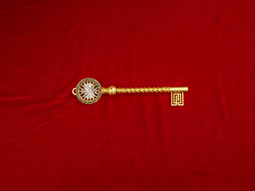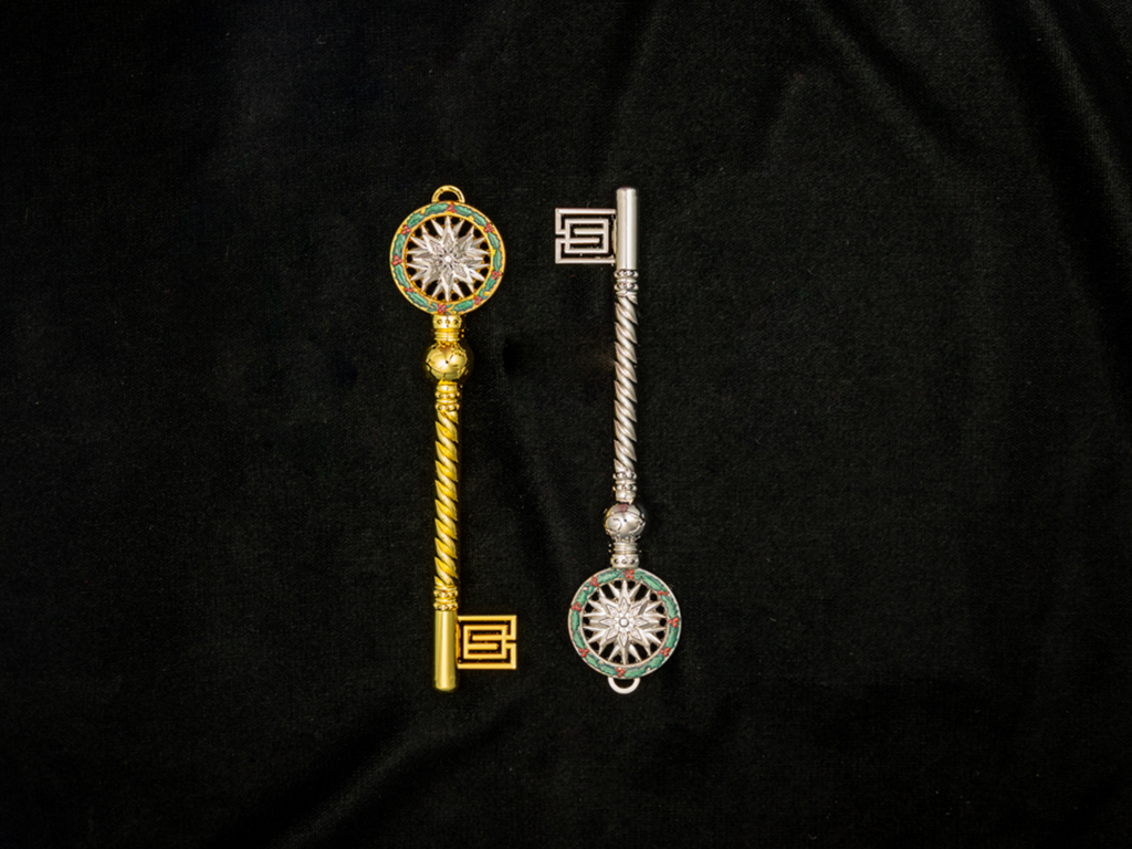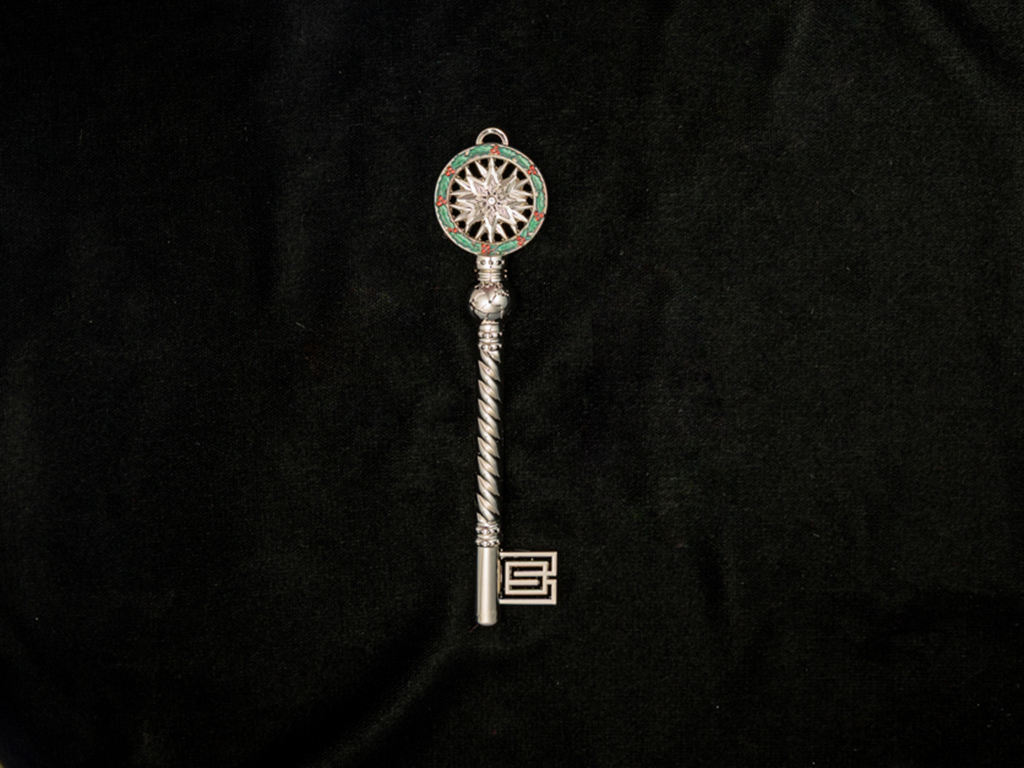 This elegant key is 5.5″ tall and has the initials SC in the lock portion of the key at the bottom, spiral column, World Globe, and Snowflake with holly wreath in Green and Red.