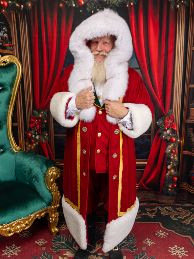 Painted snowflake/holly button front panels, gold trim, hat, pants, coat.